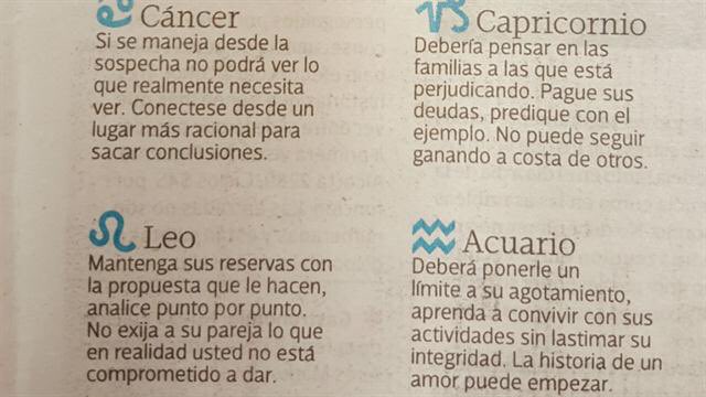 Sergio Szpolski, cuyo signo es Capricornio, pudo leer cómo se le advertía que debía cumplir con el pago de salarios. También hubo menciones en otros artículos publicados en Tiempo.