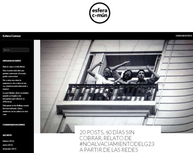 “Tenemos que preguntarnos qué nos subleva. Qué nos reúne y aglutina. Qué queremos detener o impedir. Sobre qué queremos hacer reflexionar o qué queremos construir con el otro”. Esto escribe uno de los integrantes de Esfera Común en una suerte de manifiesto artístico-político que a cada instante se engorda, se modifica, se expande, como un ser vivo que se abre paso en estos días donde la apuesta por el arte se torna fundamental para la supervivencia colectiva. “Esfera Común es un espacio, incipiente, de pensamiento y creación política y cultural. Tiene una periodicidad aleatoria de reuniones presenciales, es decir, en medio de la cultura de la virtualidad y aún utilizando las redes informáticas para comunicarnos, apostamos a los encuentros cara a cara y cuerpo a cuerpo. En lo político buscamos crear un espacio abierto a múltiples identidades con un marco definido de oponernos a las políticas neoliberales”, explica uno de sus integrantes al momento de buscar formas de definir a este espacio compuesto por colectivos audiovisuales, poetas y escritores, curadores e investigadores, comunicadores, docentes, diseñadores y músicos. El 29 de enero pasado, Esfera Común fue uno de los organizadores de las ñoquiadas con las que los trabajadores estatales denunciaron los miles de despidos arbitrarios que impulsa el gobierno de Mauricio Macri. También estuvieron en la carpa de Plaza de Mayo acompañando el reclamo para exigir la liberación de la dirigente Milagro Sala. Ahora preparan acciones de cara al paro nacional del 24, en repudio a los despidos en la administración pública y en reclamo por paritarias libres. Y además, a comienzos de este mes publicaron en su blog (esferacomun.com.ar) un relato coral del conflicto que atravesamos los laburantes del Grupo 23, a través de los posteos que fuimos haciendo en nuestros muros de Facebook. Se puede ver acá: esferacomun.com.ar/wp/2016/02/07/20-posts-y-60-dias-sin-cobrar/