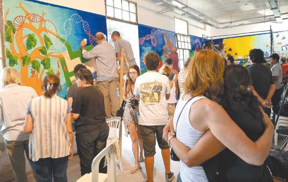 Es domingo por la tarde. Gente de todas las edades entra y sale, charla, pinta distintas zonas de la pared. El proceso comenzó el viernes. Ese día, cada quien empezó a bocetar aquellas imágenes que consideraba fundamentales. Luego las agruparon, decidieron qué historia querían contar y pusieron manos a la obra a lo largo de tres paredes que suman 12 metros de largo. Claudia, en su rol de facilitadora, se encarga de coordinar las tareas pero no interviene en la construcción material del mural, obra entera de niños, jóvenes y adultos que en muchos casos dibujan y pintan de este modo por primera vez.