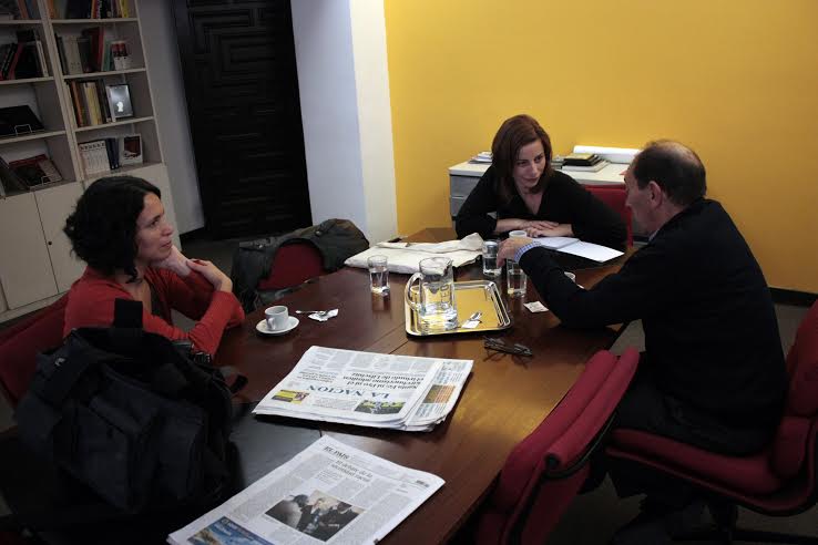 En esta foto estamos Soledad Quiroga y yo entrevistando a Pepe Ribas. Sole es la única mujer fotorreportera de Tiempo Argentino (la única “ella” en medio de “ellos”). Yo soy redactora en la sección cultural del diario. Pepe Ribas fue el creador de una revista mítica (y contracultural) llamada Ajoblanco, que hizo historia en la España posfranquita hasta que se dejó de editar a fines de los noventa. Pude leer algunos de los últimos números que se conseguían en Rosario, donde me mudé para estudiar comunicación social, cuando no había internet y cuando deseaba con todo mi corazón dedicarme al periodismo gráfico.